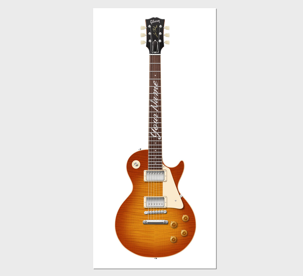 Gibson Les Paul has to be one of the most iconic electric guitars in the history of rock ‘n’ roll. The rich and warm sounds produced by the unique humbucker pickup has inspired countless guitar greats from the past to present. Here is an art print of this iconic guitar that will surely look stunning on your wall or make a perfect gift for any guitar enthusiast. You can personalize the print by adding your own name on the fretboard (max. 15 characters).