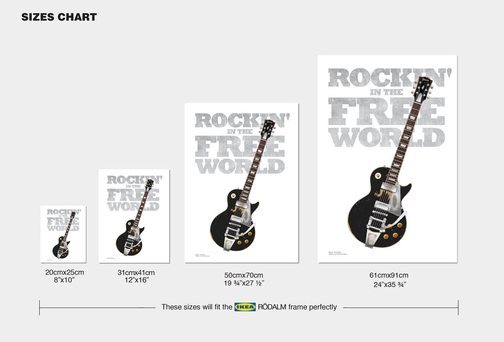 Neil Young's Gibson Les Paul "Old Black" started life as a 58 Les Paul Gold Top and has been heavily modified and played so hard by Neil throughout its life. You can hear the sound of this guitar on most of Neil Young's electric guitar songs. Here is an art print design of this iconic guitar feature one of his most iconic tune “Rockin' in the Free World” that will surely look stunning on your wall or make a perfect gift for any guitar enthusiast.