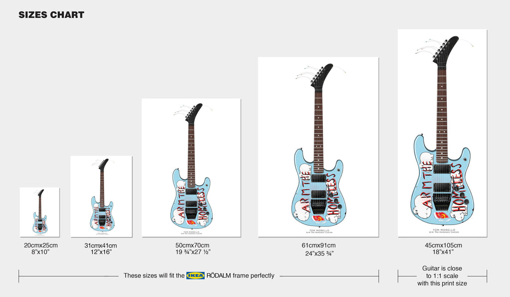 Arguably Tom Morello's most famous guitar, the "Arm The Homeless" custom electric guitar he used extensively with Rage Against The Machine. Here is an art print of this iconic guitar that will surely look stunning on your wall or make a perfect gift for any guitar enthusiast.